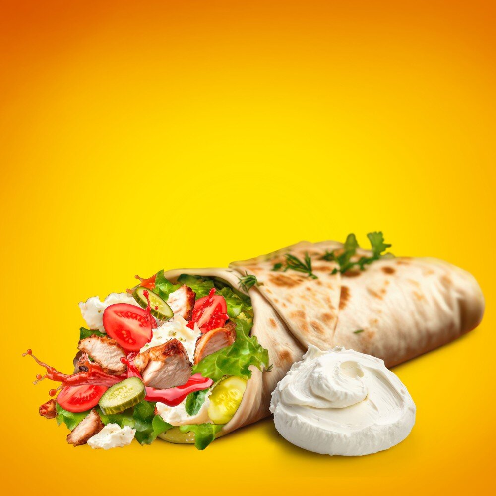 Курочка гриль, армянский лаваш, сыр «Cream Cheese», капуста, свежий огурец, помидор, соус чесночный, томатный соус