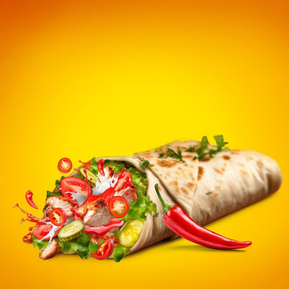 Курочка гриль, армянский лаваш, перец халапеньо, капуста, помидор, маринованный огурец, чесночный соус, остро-жгучий соус сальса